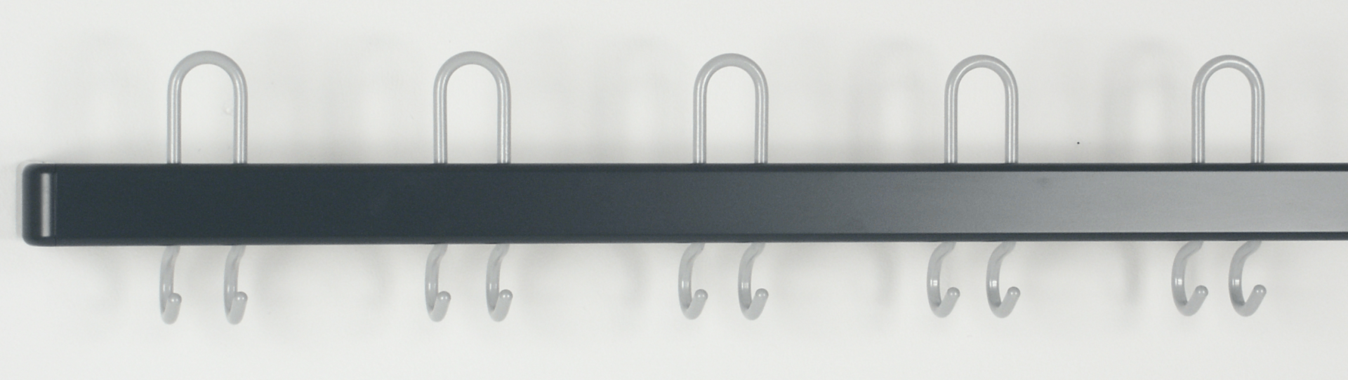 Die Alublende, 60mm hoch, ist silber eloxiert oder farbig lackiert in den unten angegebenen 6 Haken-Varianten lieferbar. Standardmäßig sind die Haken schwarz beschichtet. Gegen Aufpreis können die Haken auch silberfarben, in Edelstahl oder farbig lackiert geliefert werden. Als Abschlüsse stehen Aluminium-Abschlussbögen zur Wand in Leistenfarbe zur Verfügung.