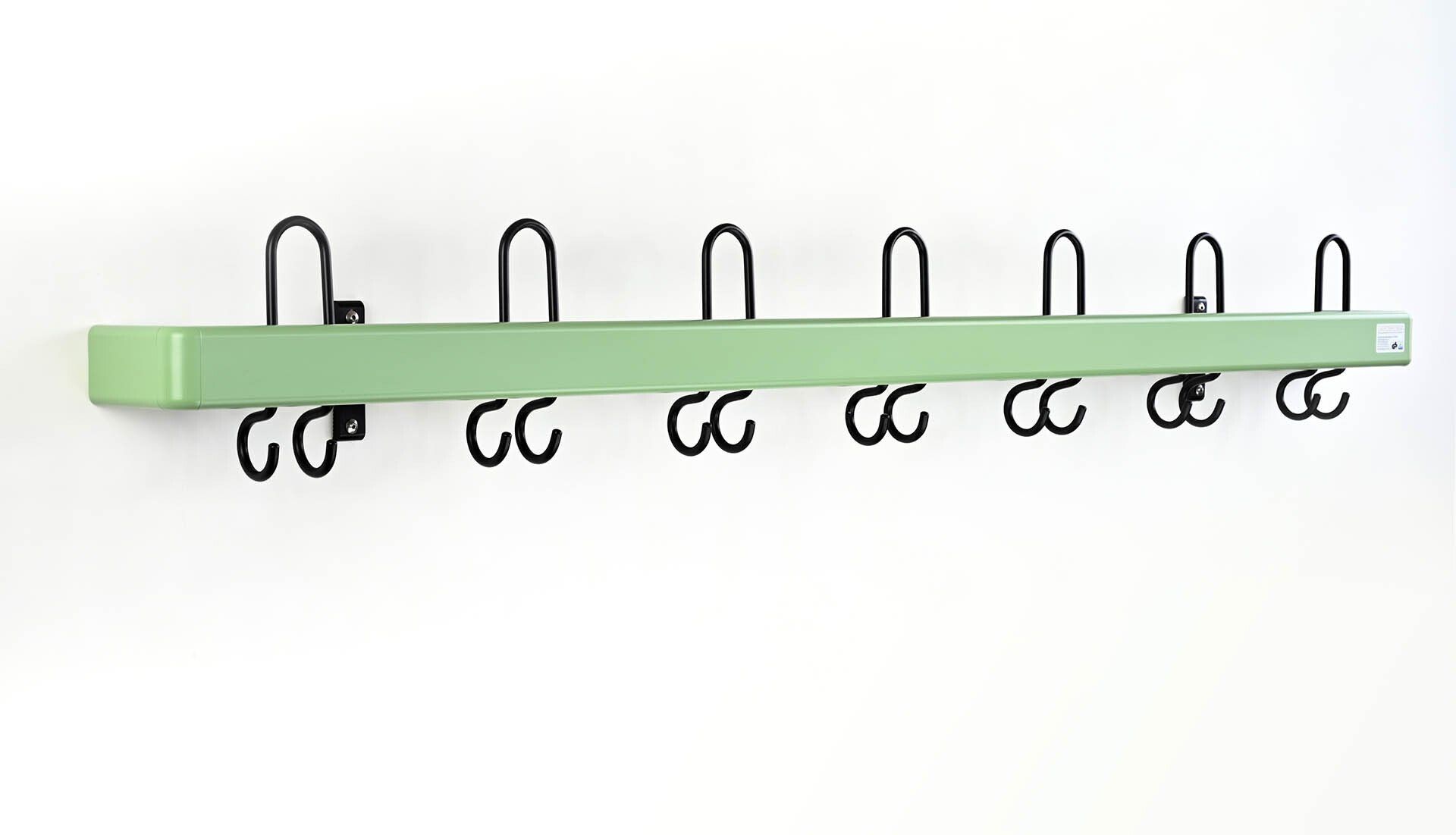 Farbpalette lackiert werden. Als Abschlüsse stehen wahlweise farblich passende Aluminium Abschlussbögen zur Wand (Retouren) oder schwarze Kunststoff-Abschlusskappen zur Verfügung. Die Haken sind standardmäßig schwarz beschichtet. Gegen Aufpreis liefern wir sie auch silberfarben, in Edelstahl oder farbig gemäß
